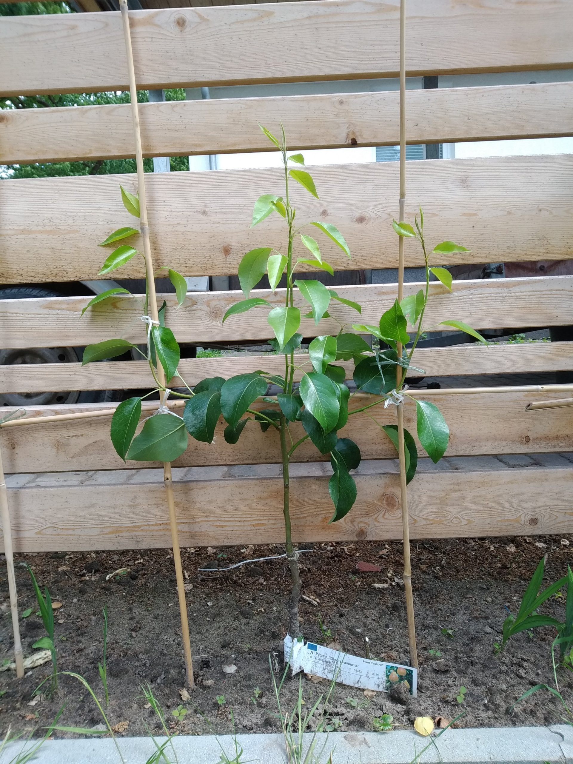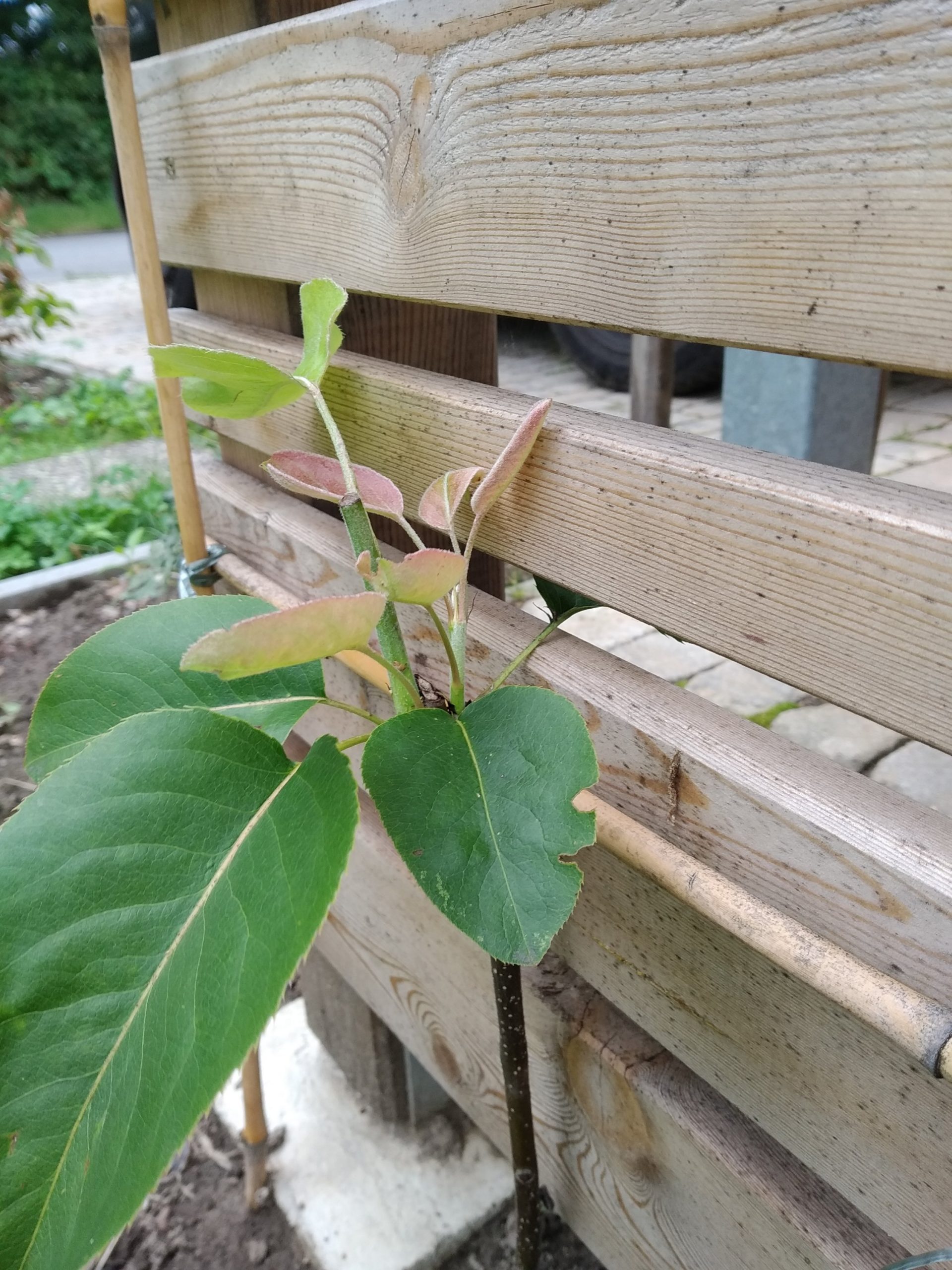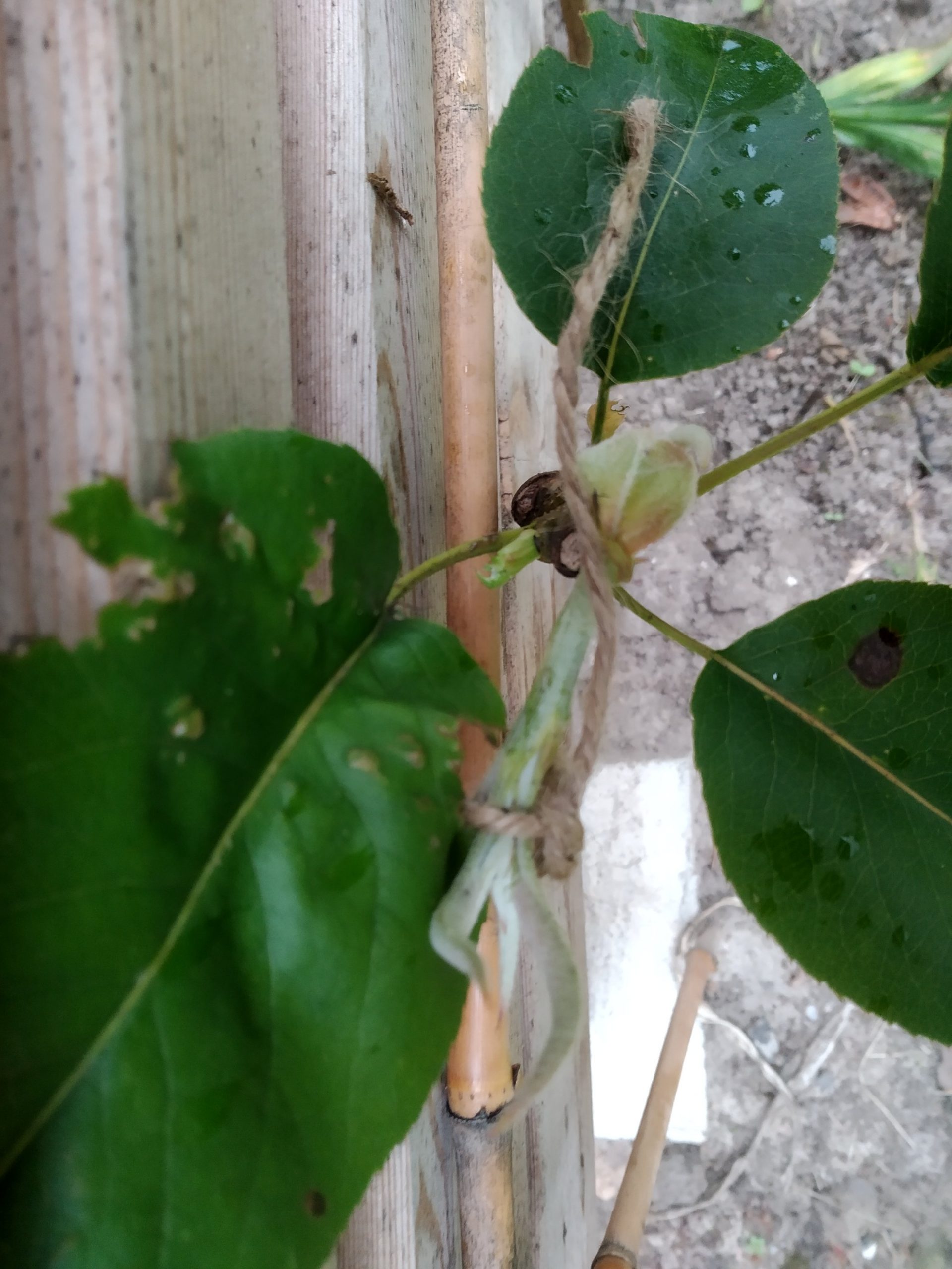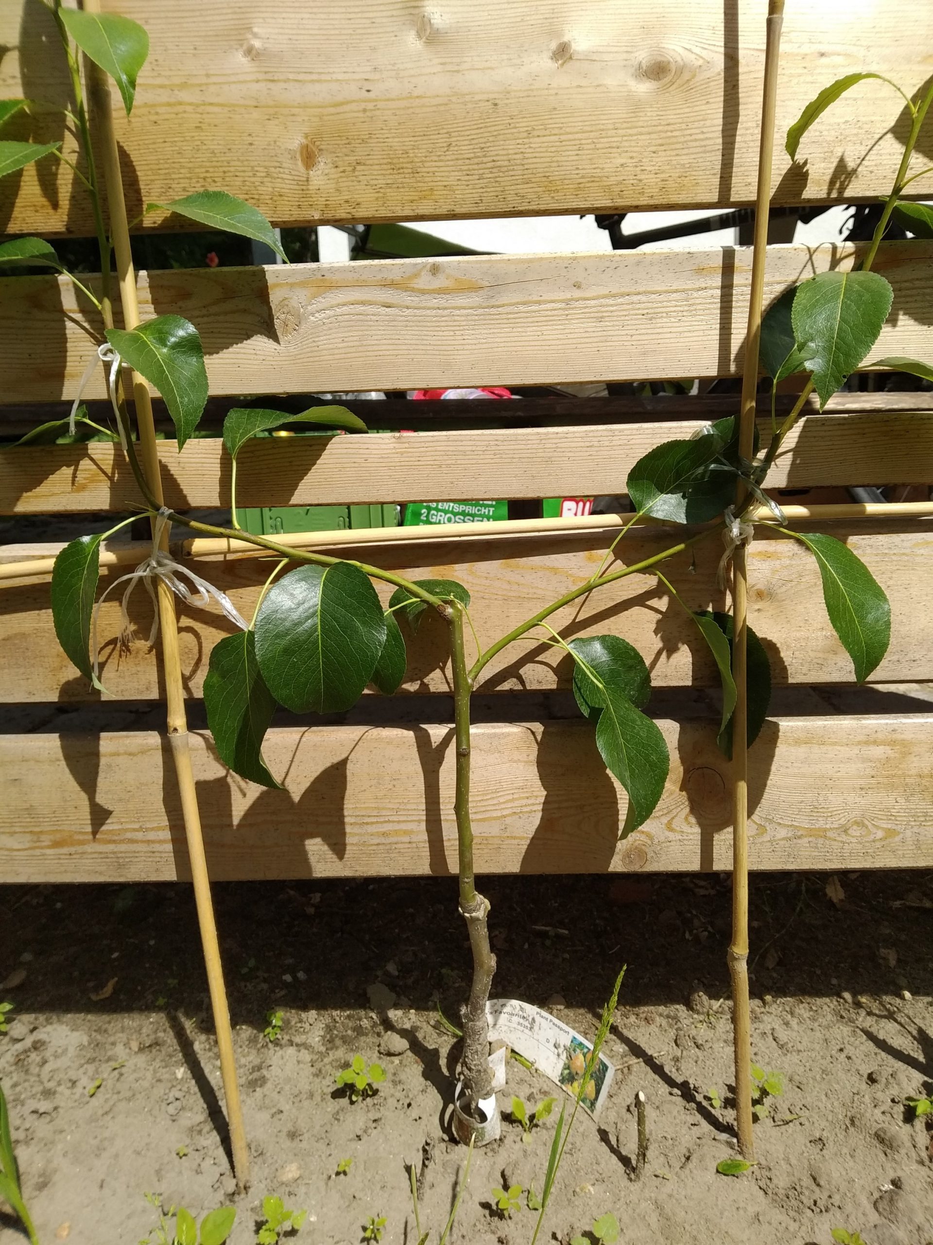 Die Birnen habe ich im Februar auf zwei Augen geschnitten. Bei einigen, wo es sich anbot, habe ich ein Ersatzauge stehen lassen. Aber am Ende sollen sie zu einem einfachen U-Spalier herangezogen werden. Dafür habe ich eine schwachwachsende Unterlage ausgewählt: Quitte A