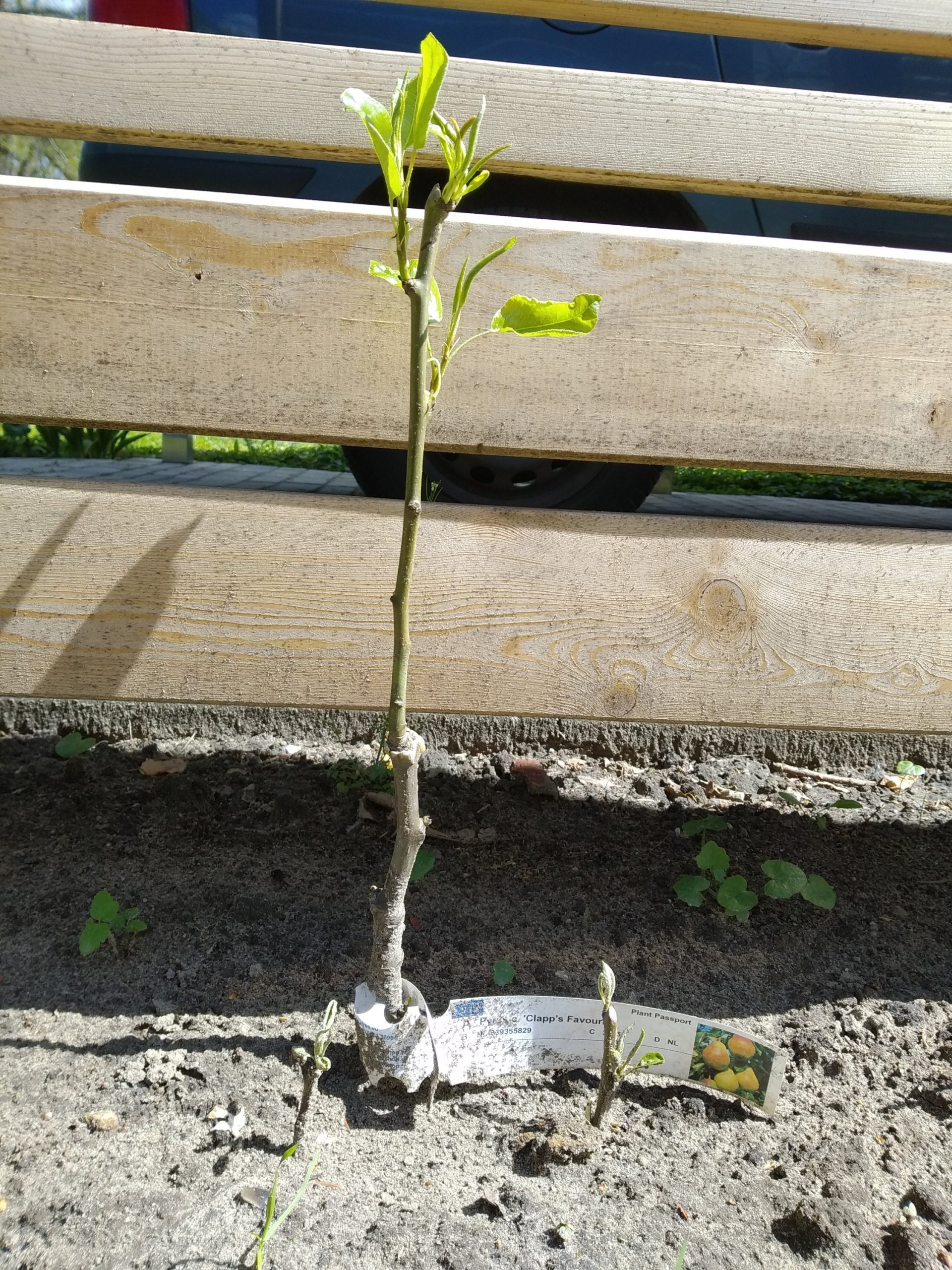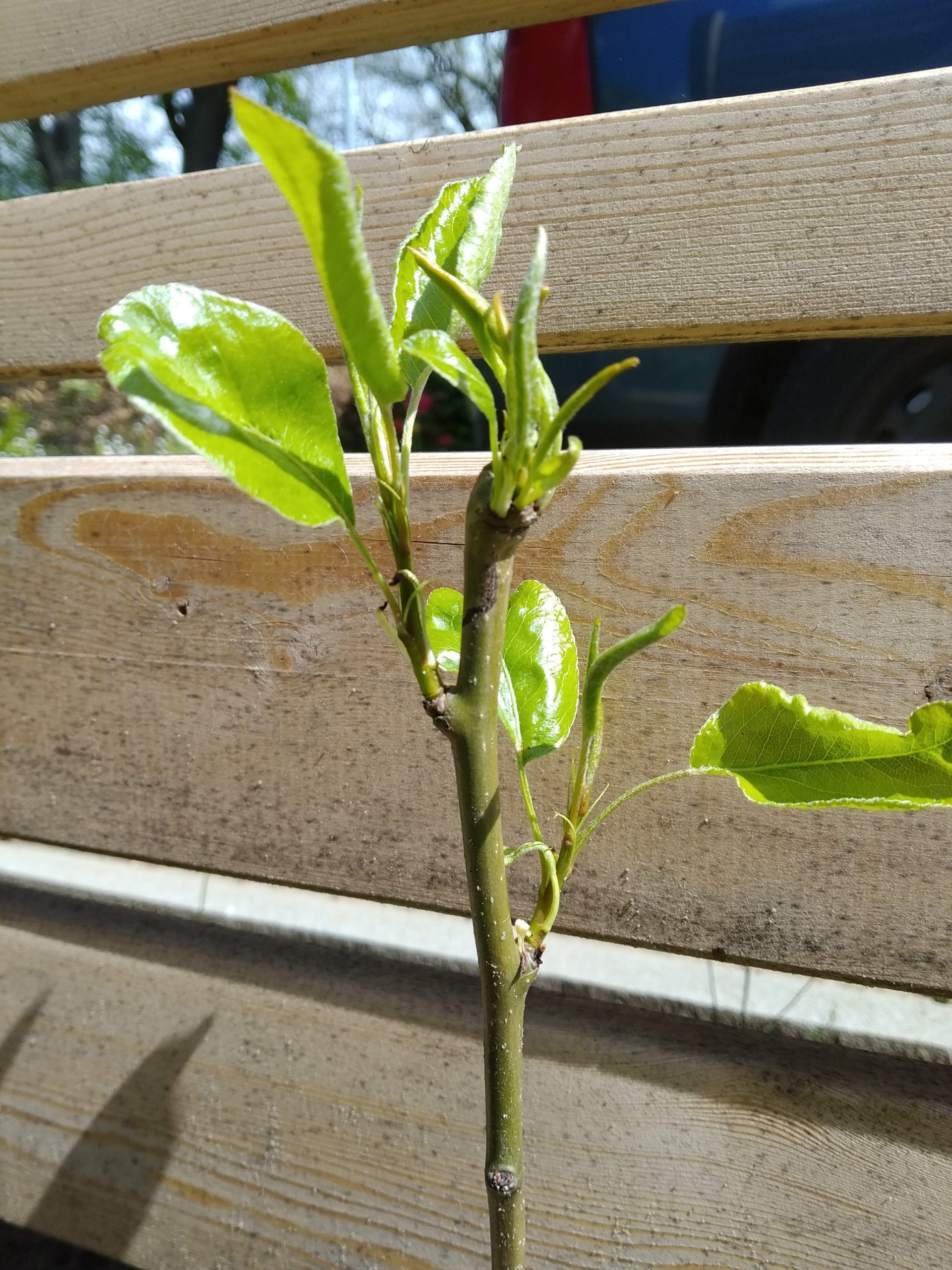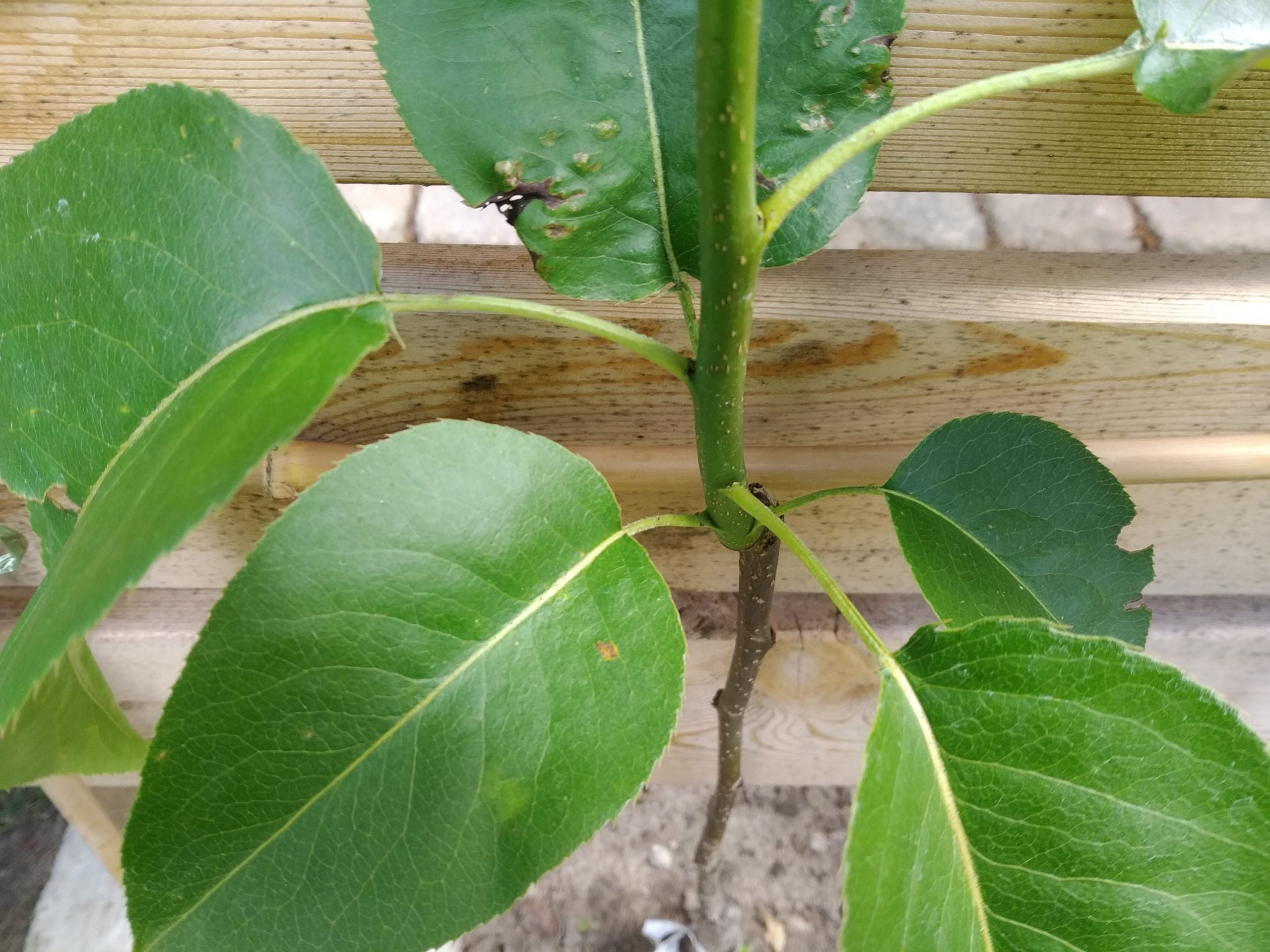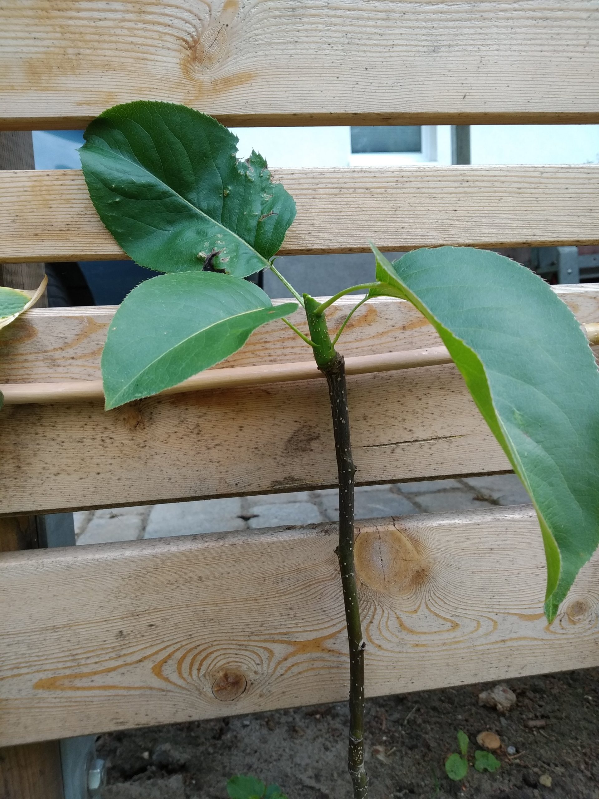 Die Birnen habe ich im Februar auf zwei Augen geschnitten. Bei einigen, wo es sich anbot, habe ich ein Ersatzauge stehen lassen. Aber am Ende sollen sie zu einem einfachen U-Spalier herangezogen werden. Dafür habe ich eine schwachwachsende Unterlage ausgewählt: Quitte A