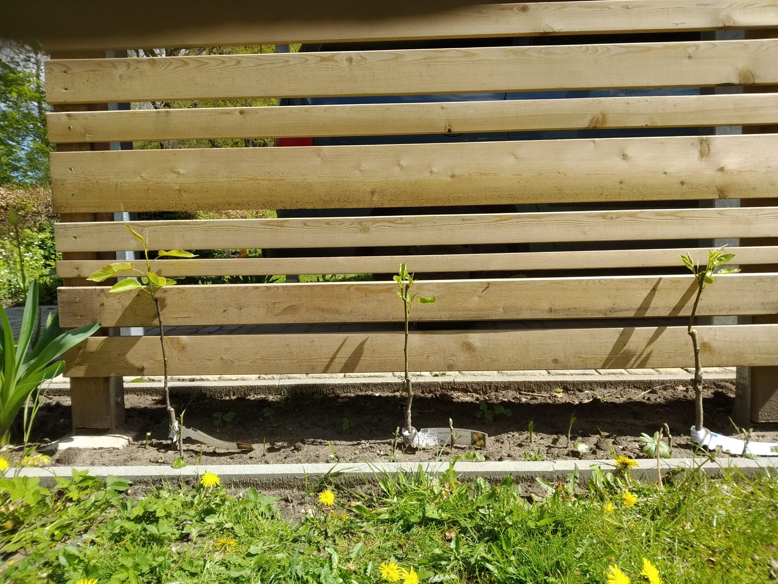 TAMA treibt leider hinten/vorne aus, ggfs muss ich sie nochmals ausbuddeln und um 90° drehen. Dabei kann ich sie auch noch etwas tiefer setzen, dann sind die neuen Arme gleich auf richtiger Spalierhöhe.