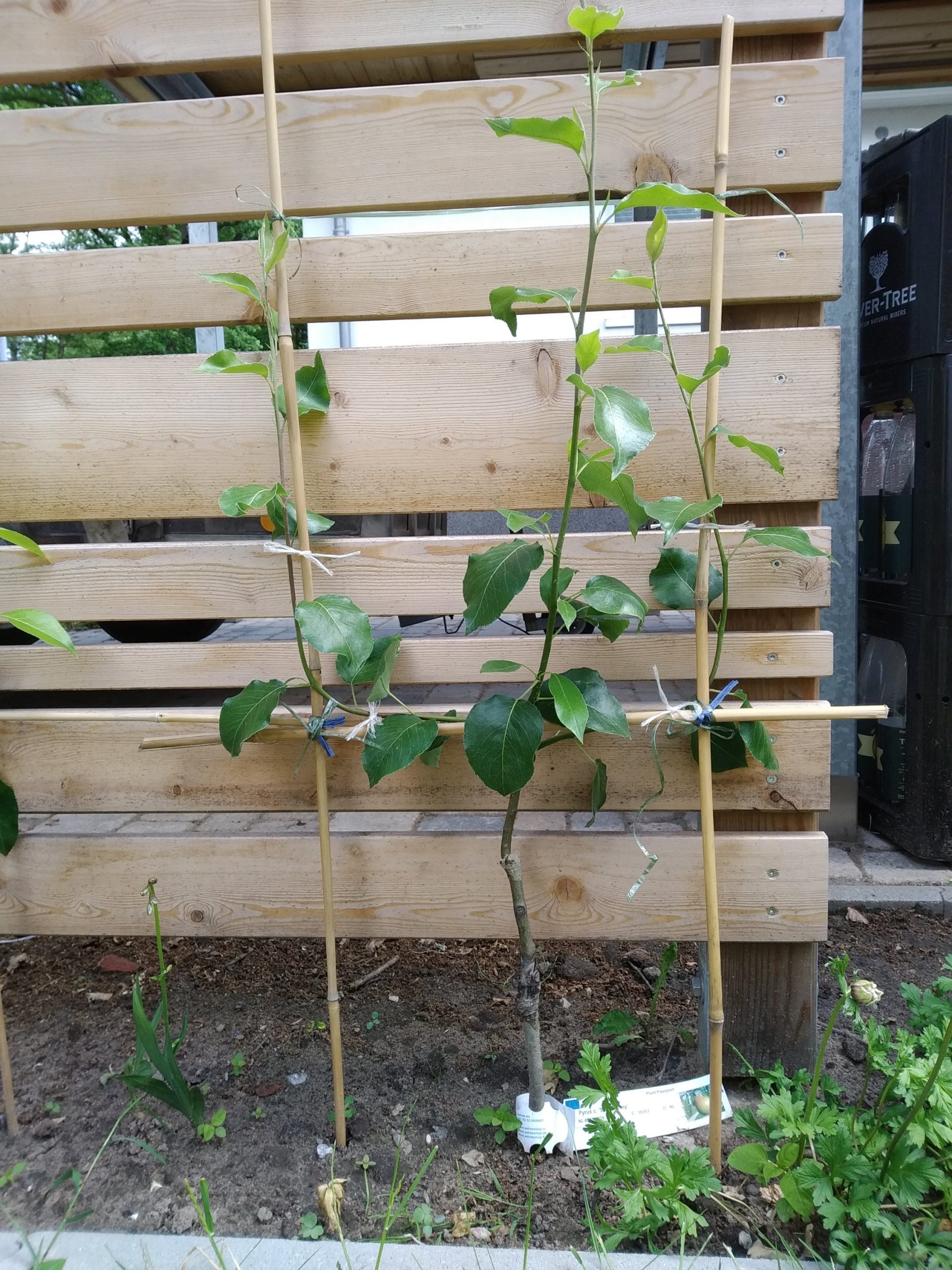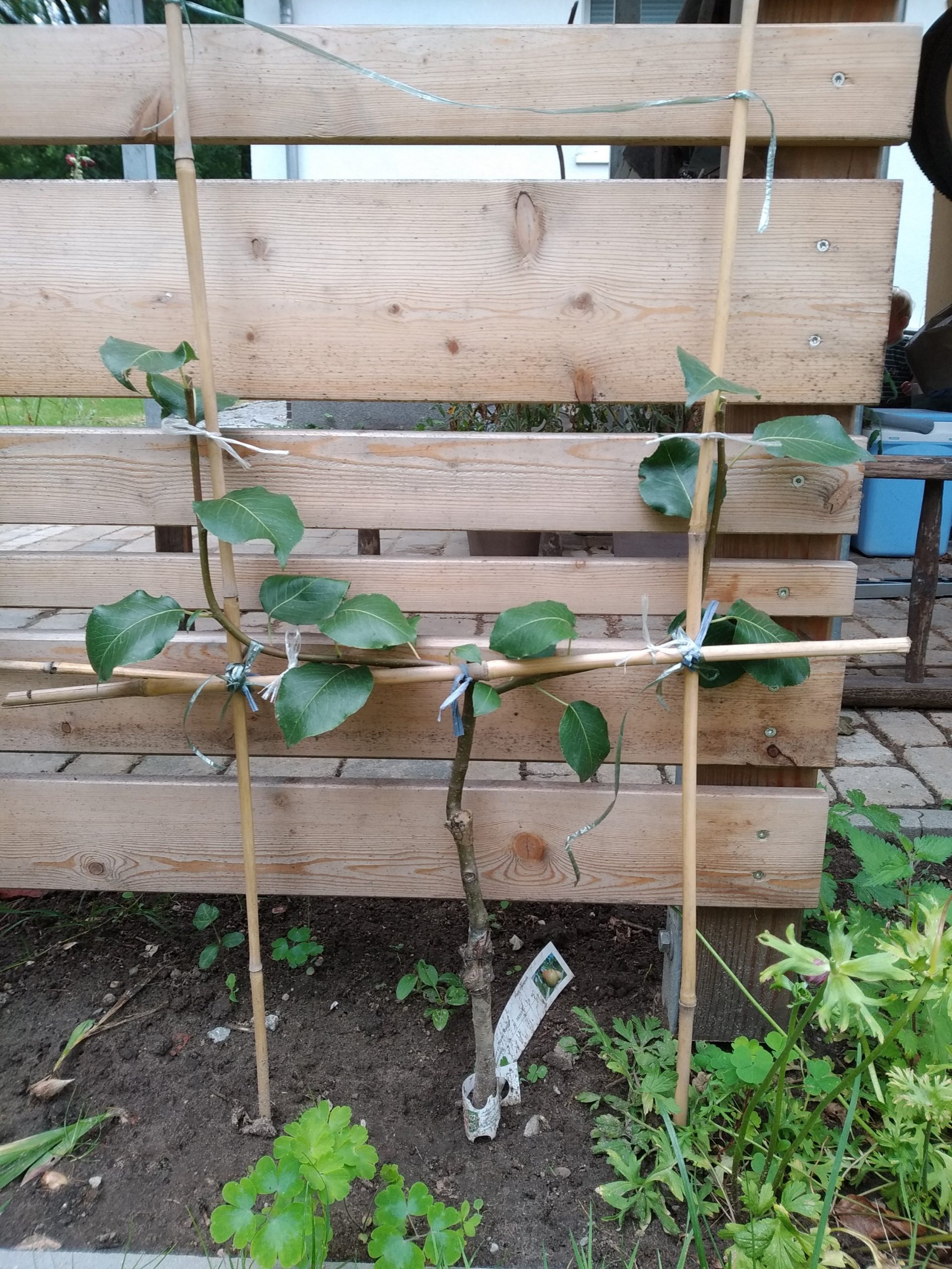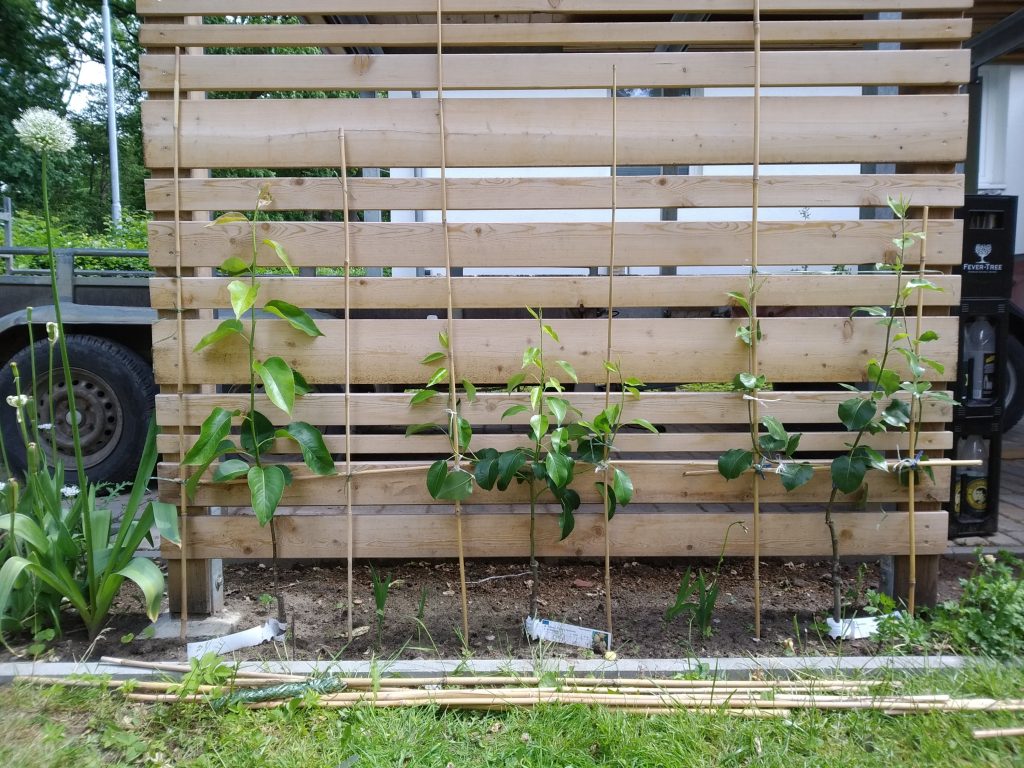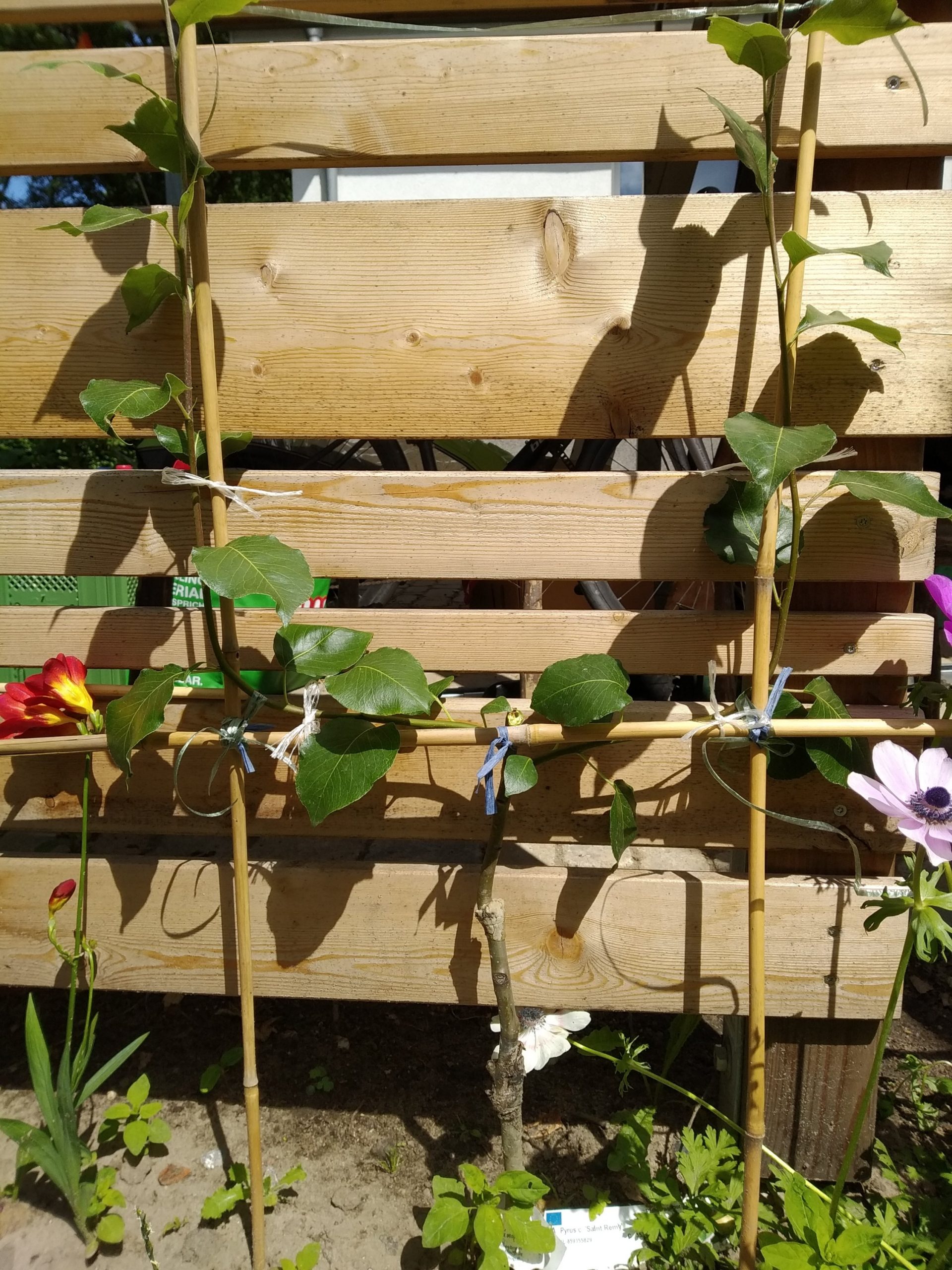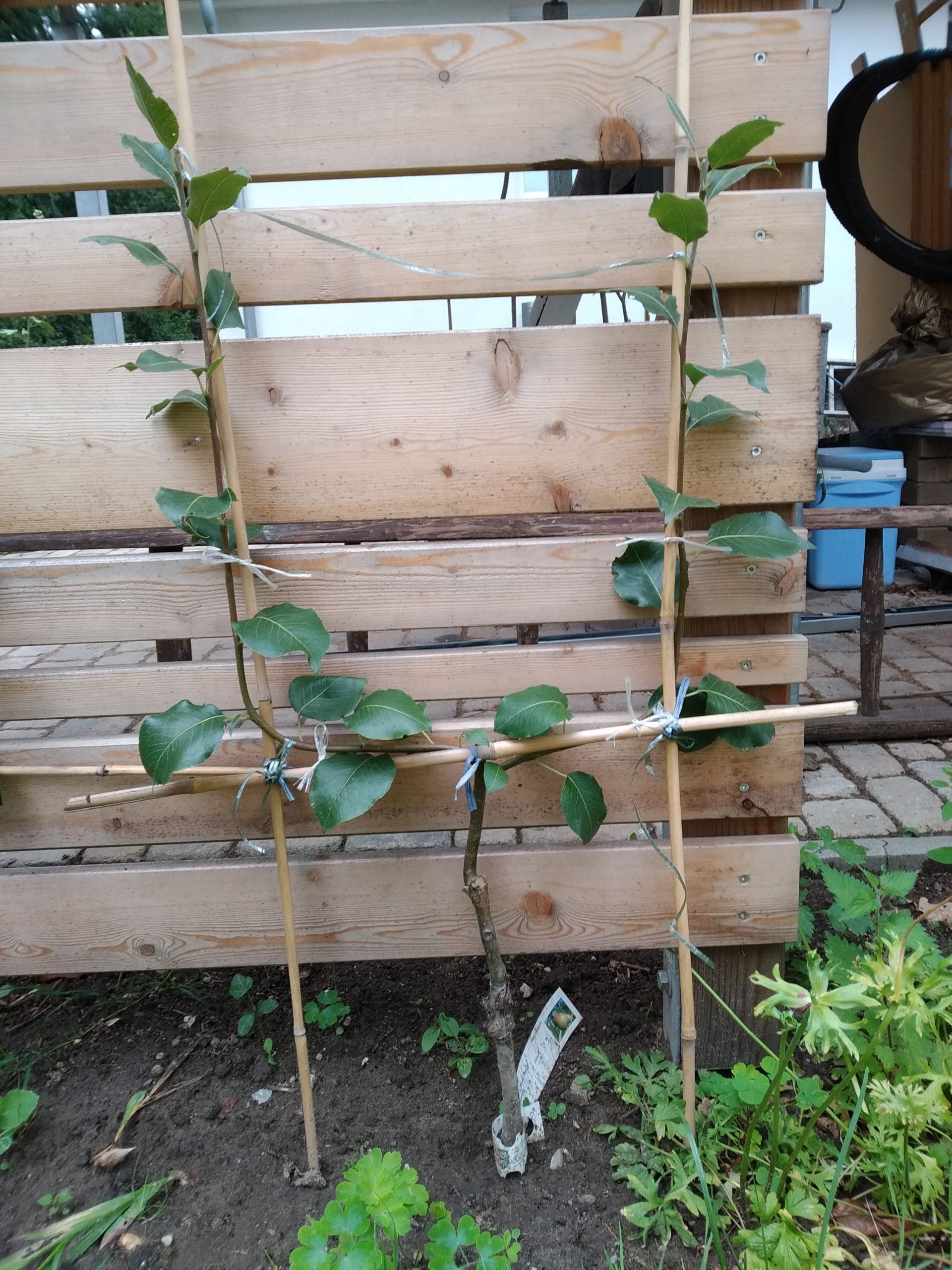 Alle haben im Juni ein Bambusspalier erhalten. Sorgenkind hier ist die Nashi: keider hat sie nur einen Trieb ausgebildet…fehlt also ein weiterer für das U-Spalier