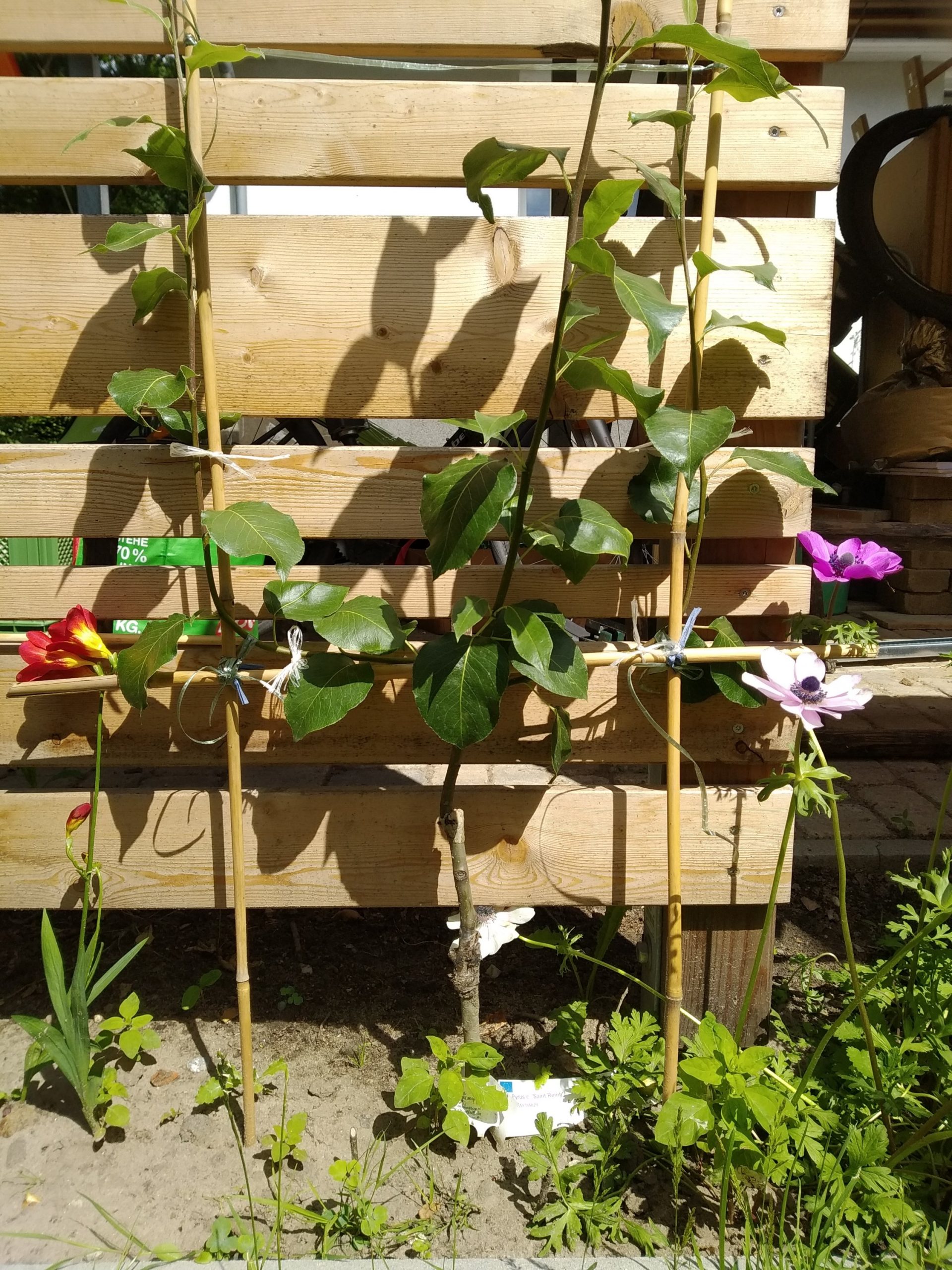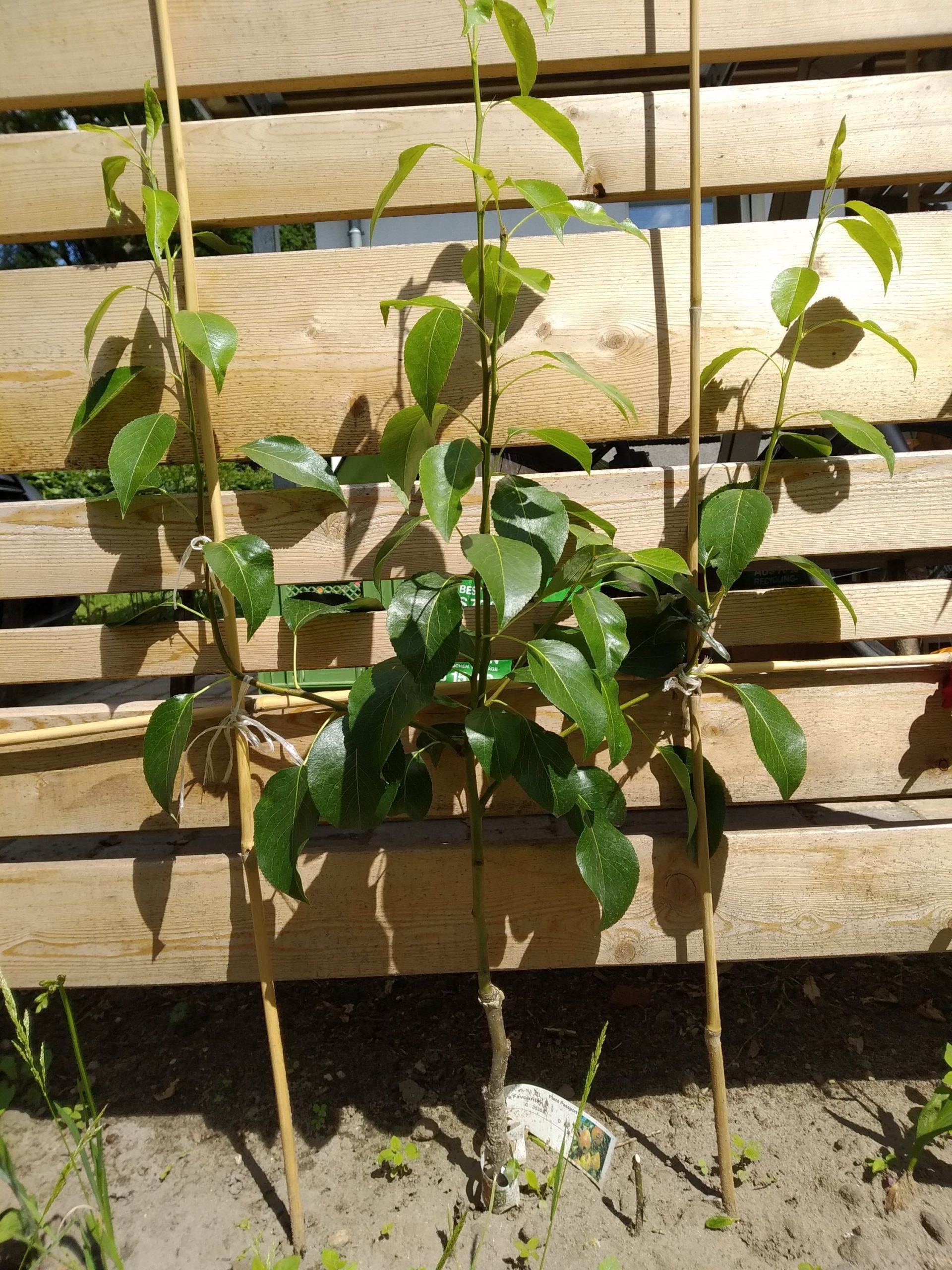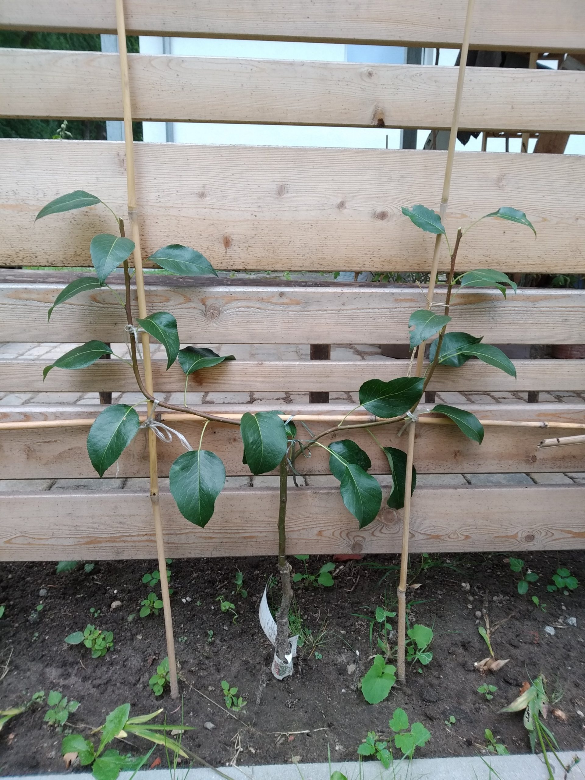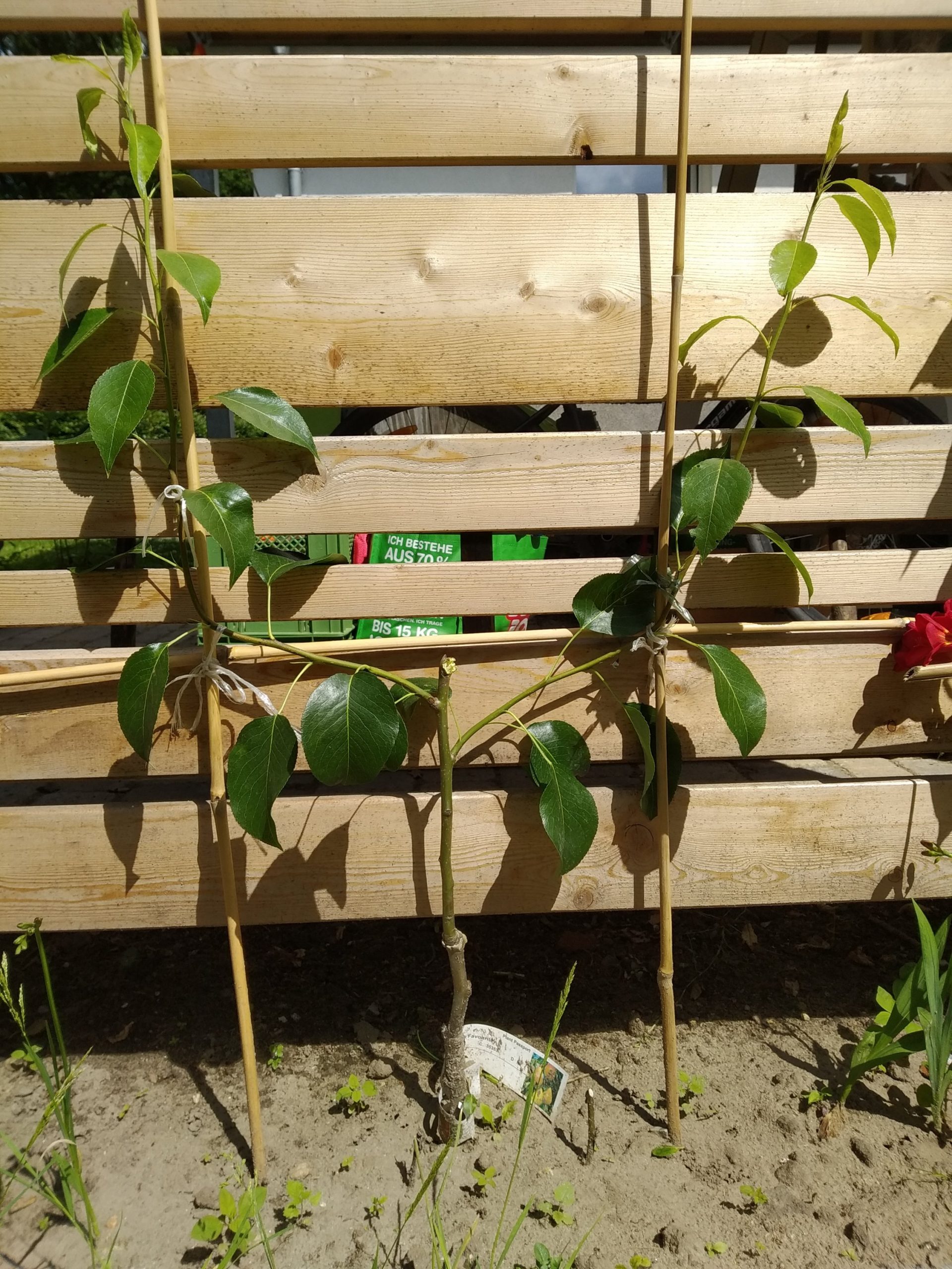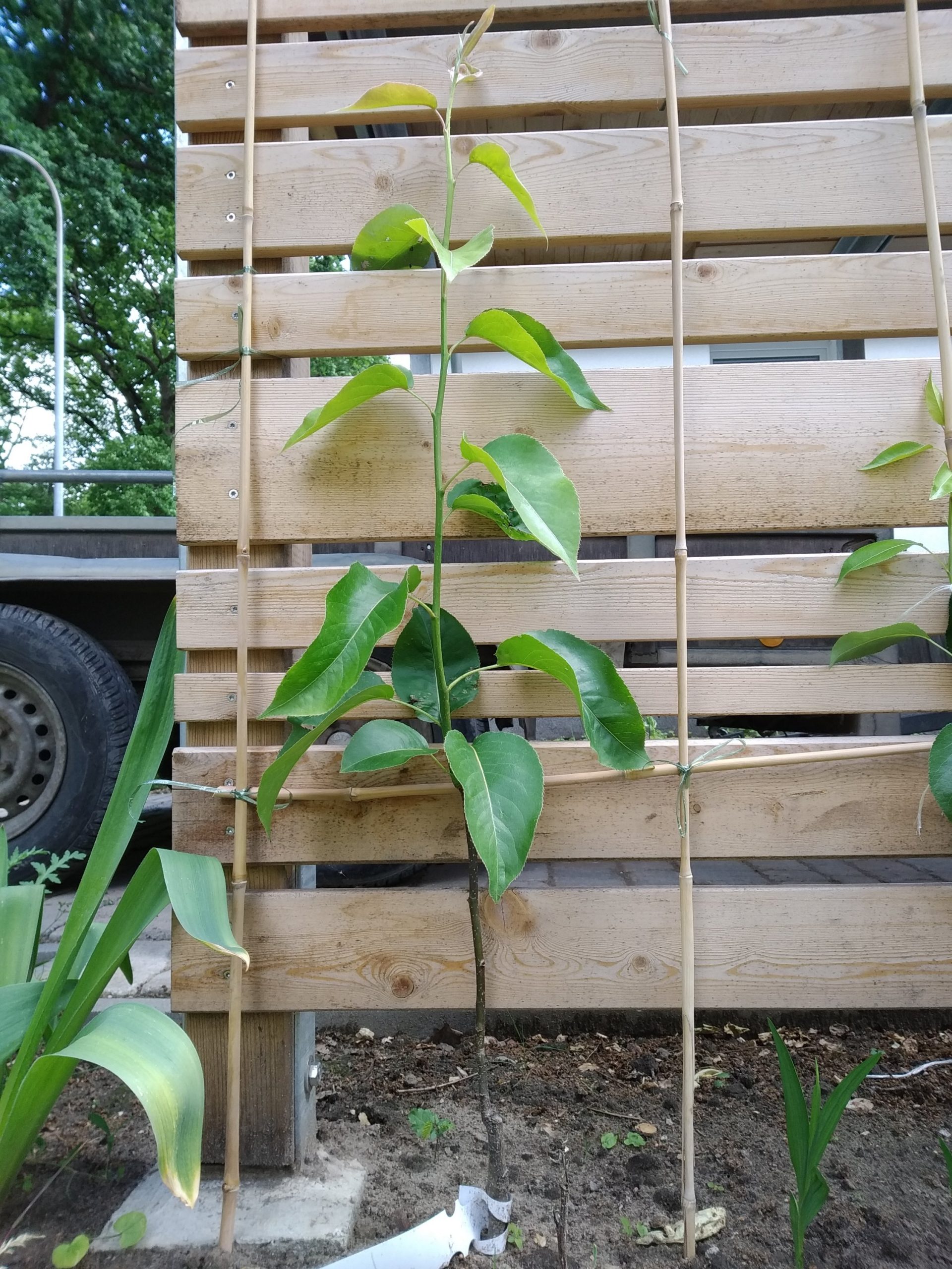 Alle haben im Juni ein Bambusspalier erhalten. Sorgenkind hier ist die Nashi: keider hat sie nur einen Trieb ausgebildet…fehlt also ein weiterer für das U-Spalier