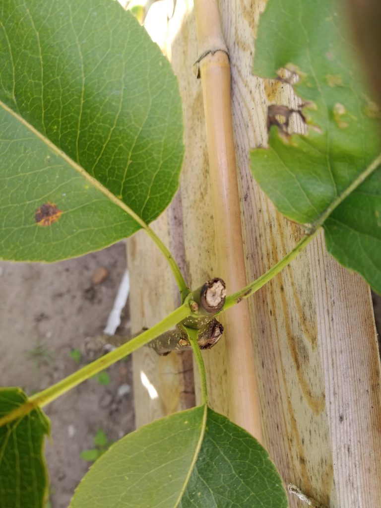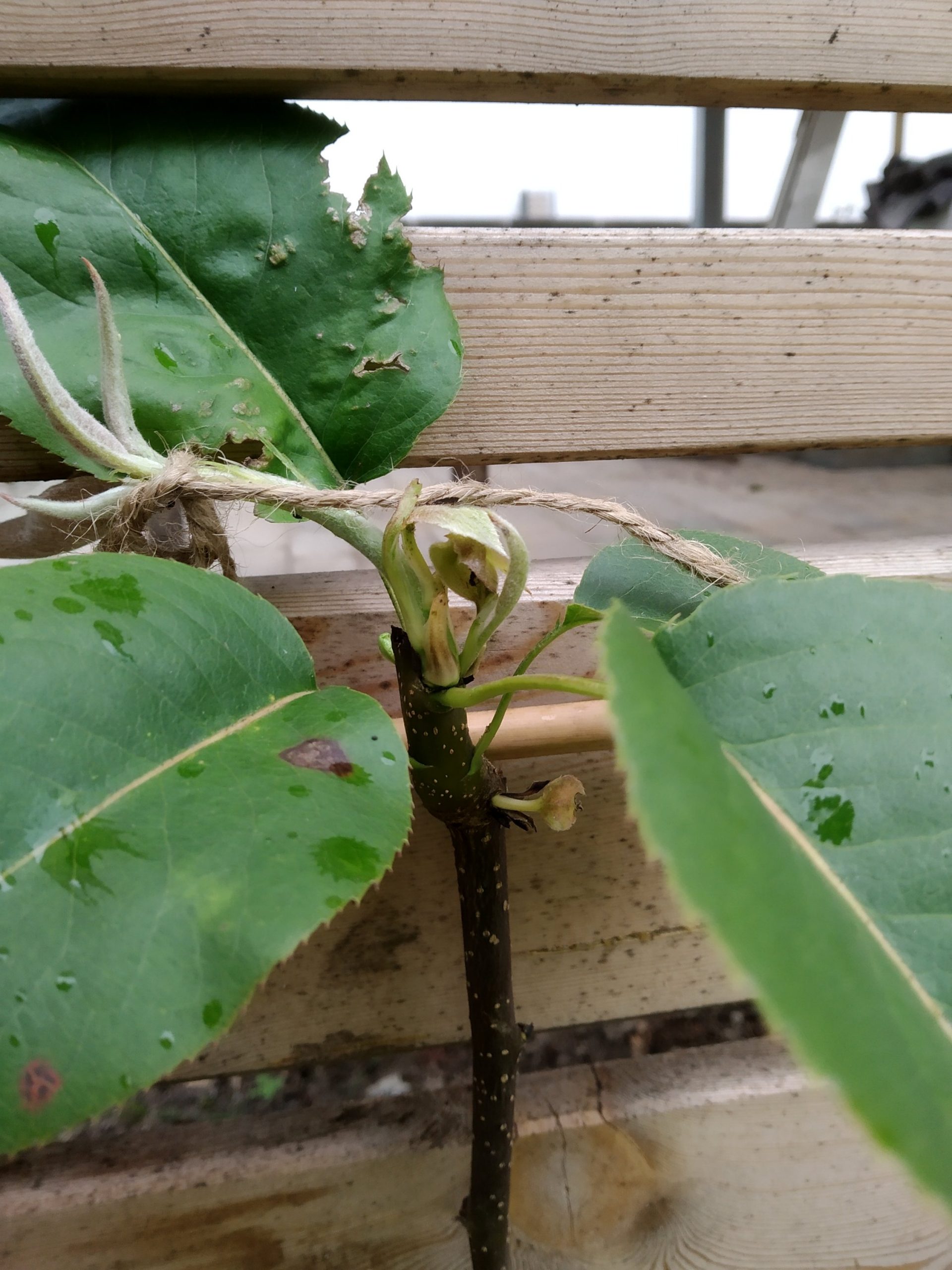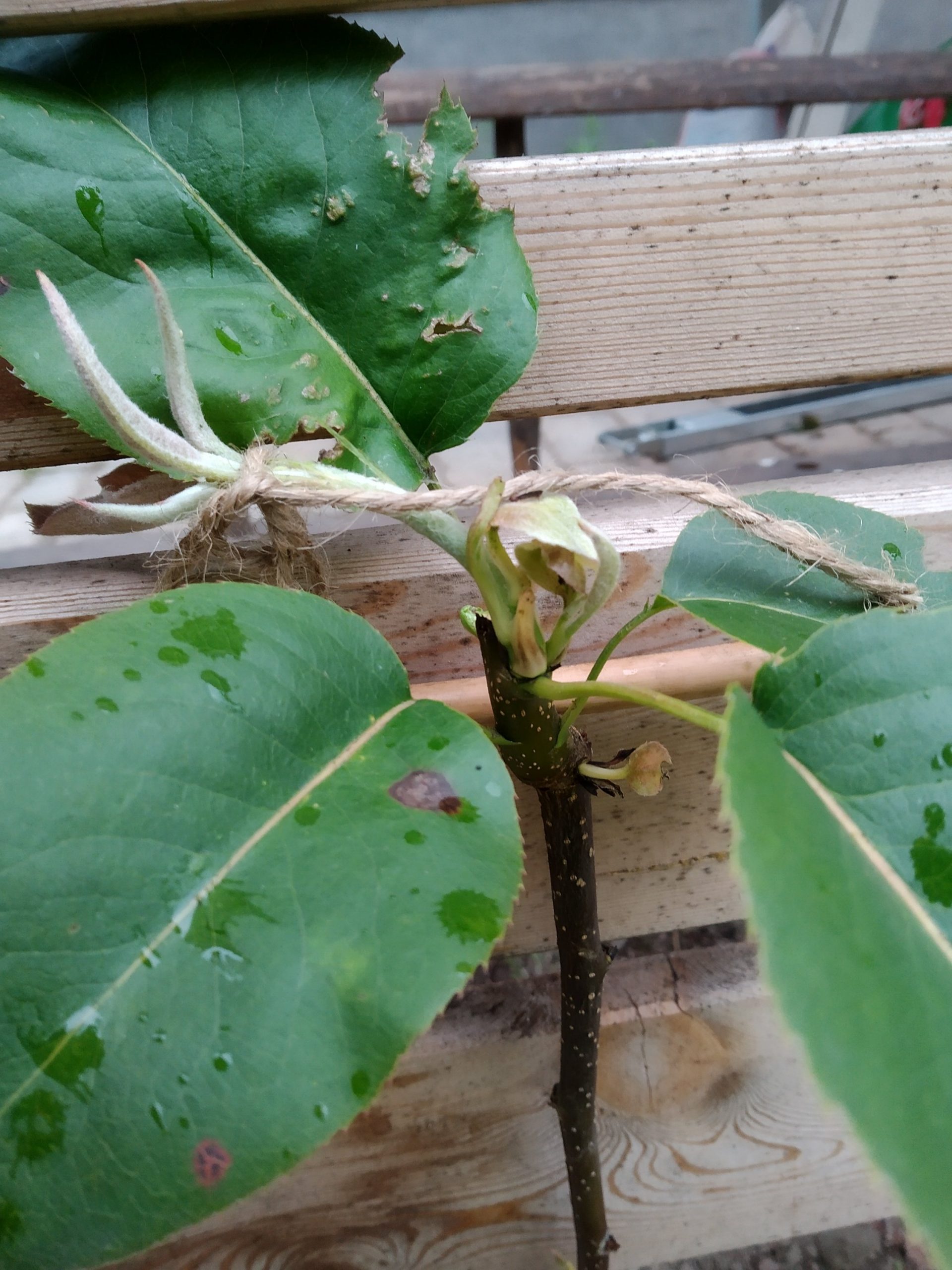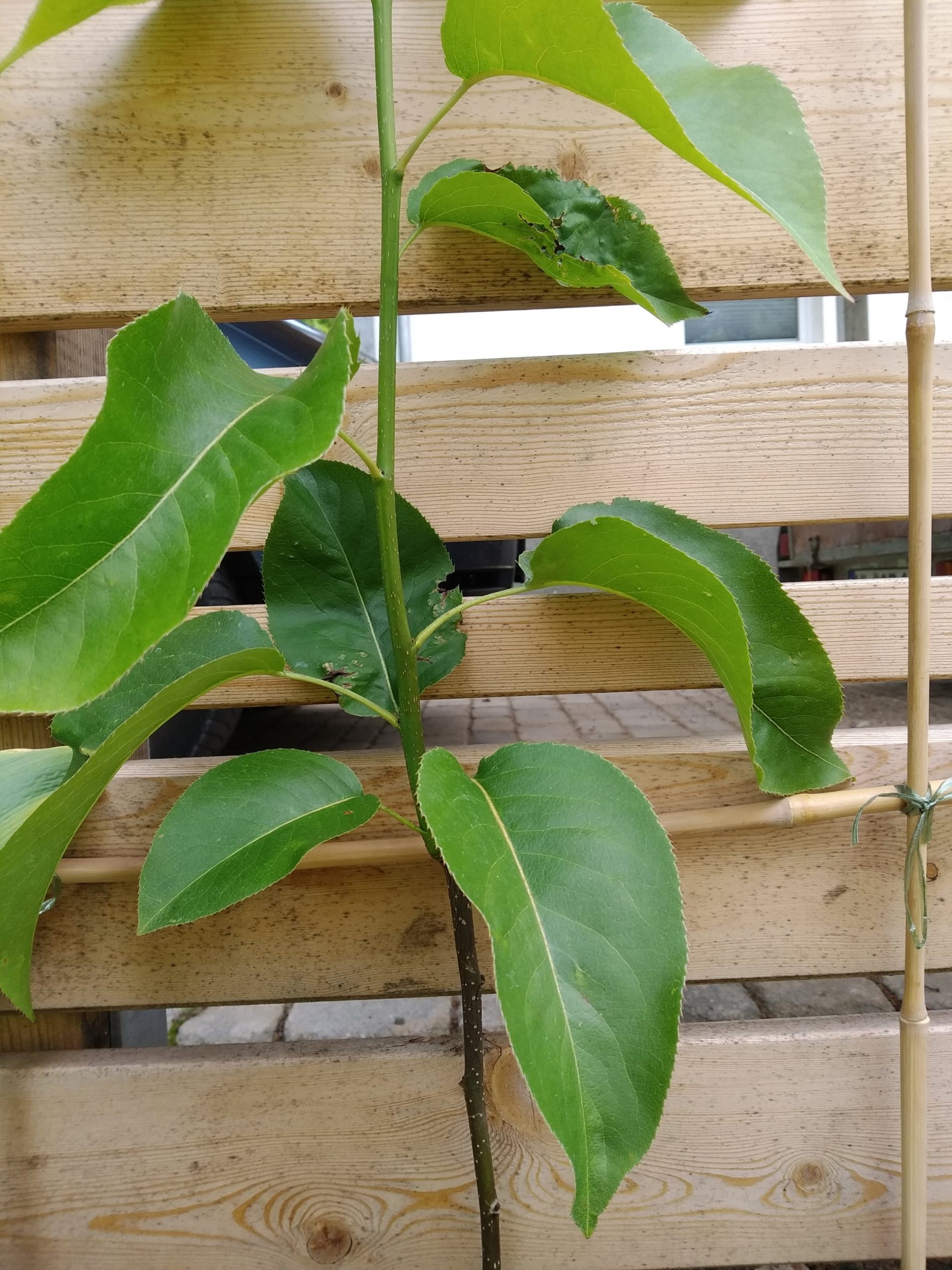 Es macht den Anschein, dass die Tama sich mit einem Trieb zufrieden gibt. Die anfangs gleichweit entwickelten Triebe sind stark zurückgefallen, einer scheint sogar zu vertrocknen….ich habe daraufhin den Leittrieb zur Seite gebunden in der Hoffnung, dass die anderen Triebe nachziehen….wenigstens ein weiterer, damit das U-Spalier zustande kommt.